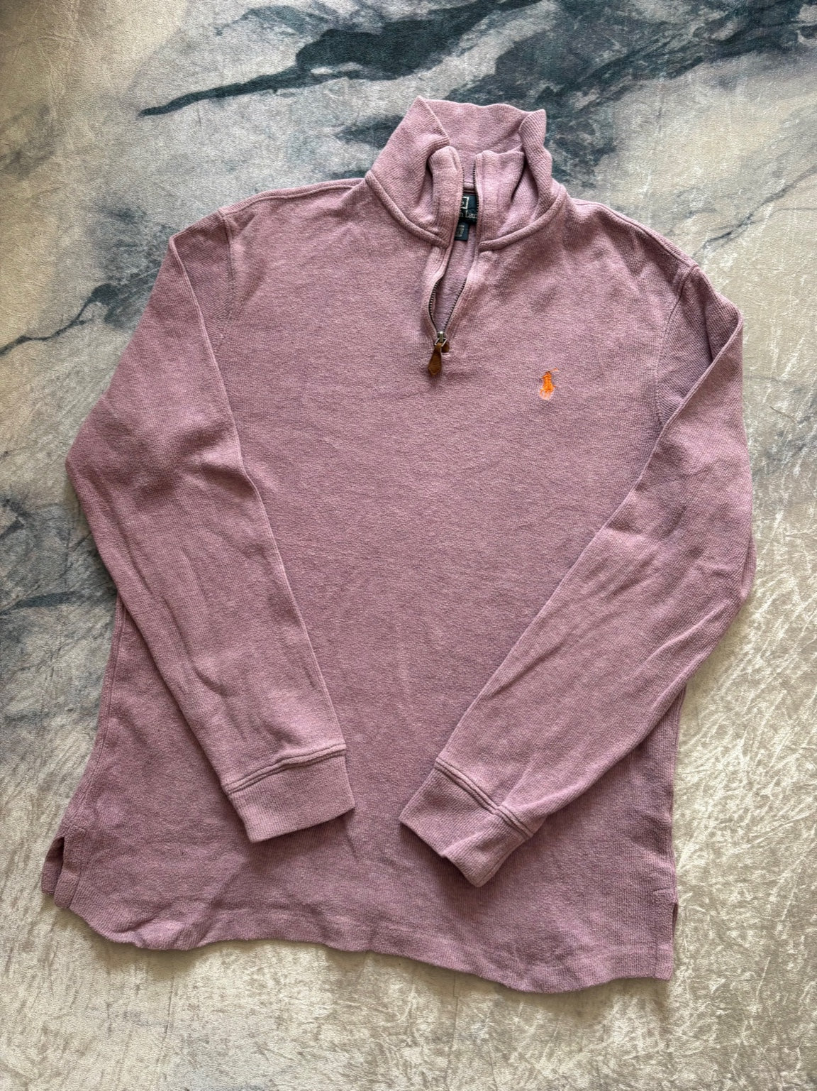 Unique lavender half-zip sweatshirt from Polo by Ralph Lauren with orange embroidered logo and leather detail on the zipper. A rare color variant in a classic casual fit – soft, comfy and full of character.