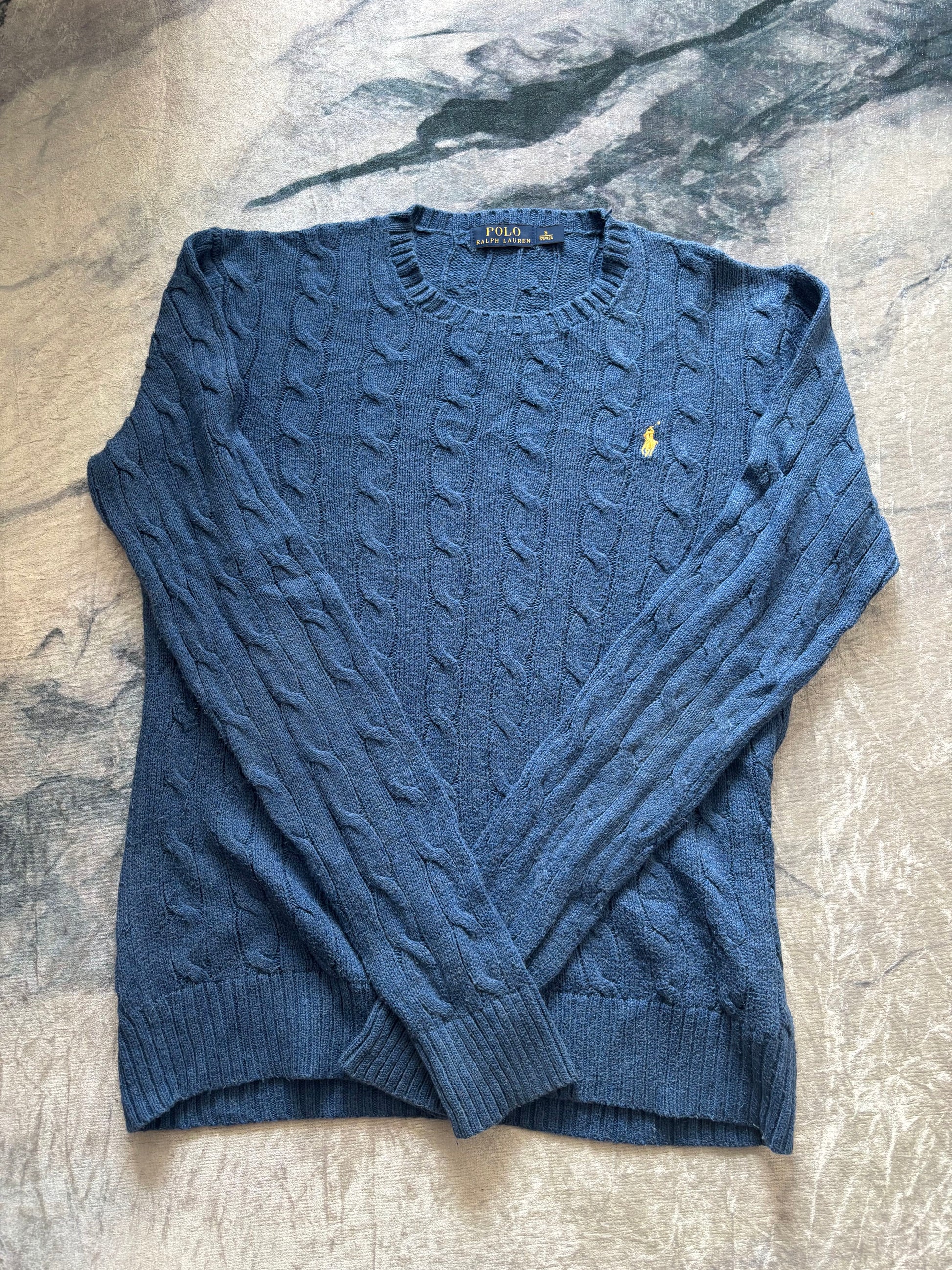 Dark blue cable knit sweater from Polo Ralph Lauren with iconic yellow logo on the chest. Made in a soft cotton blend with a classic crewneck and tight ribbed hem. A lightweight wardrobe staple that always works – casual, preppy and stylish.