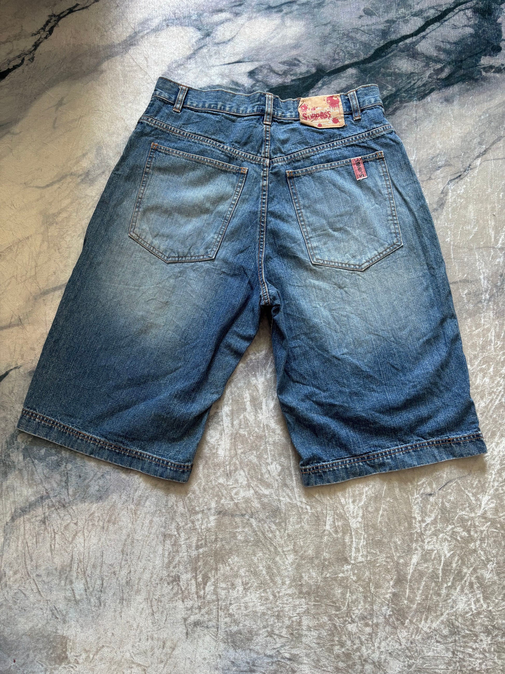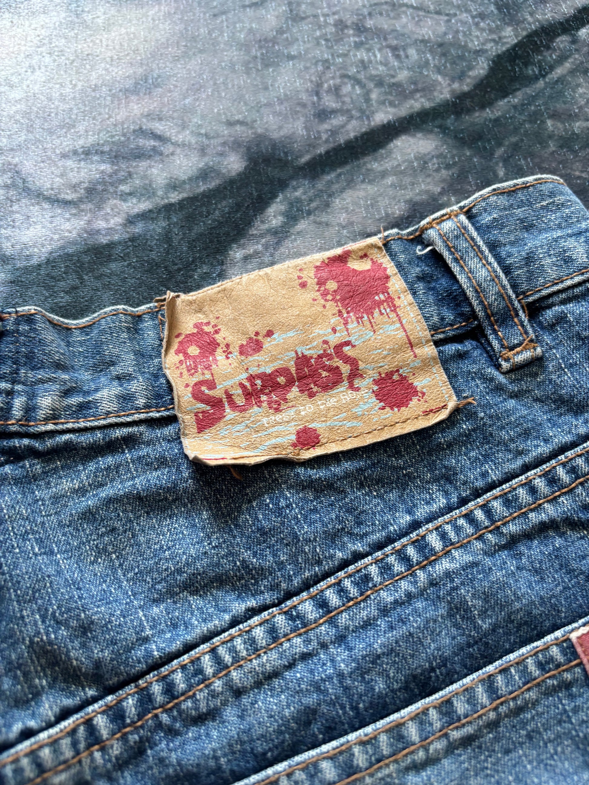 Unique vintage jorts with a strong visual touch. These dark blue Surpass jorts stand out with a red “blood splatter” patch on the back and a classic 2000s fit. The look speaks for itself – raw, retro and rare.
