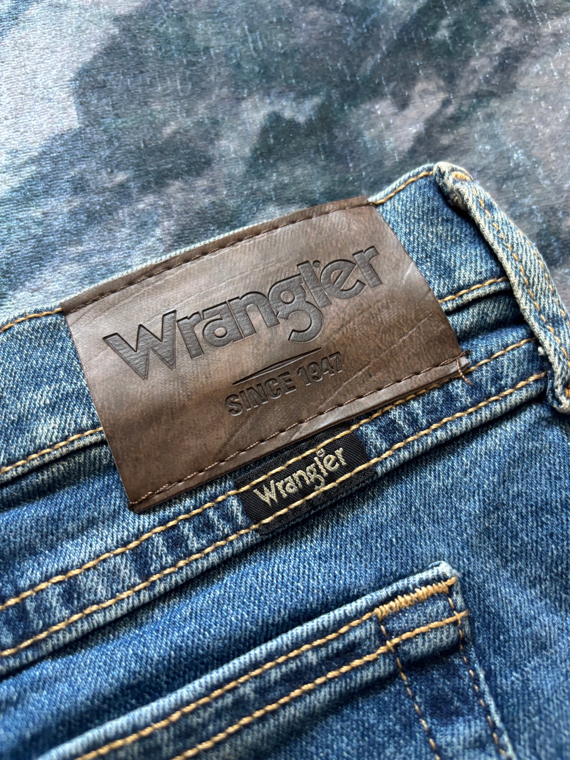 🔹 Leather patch, “W” stitching and 5-pocket design