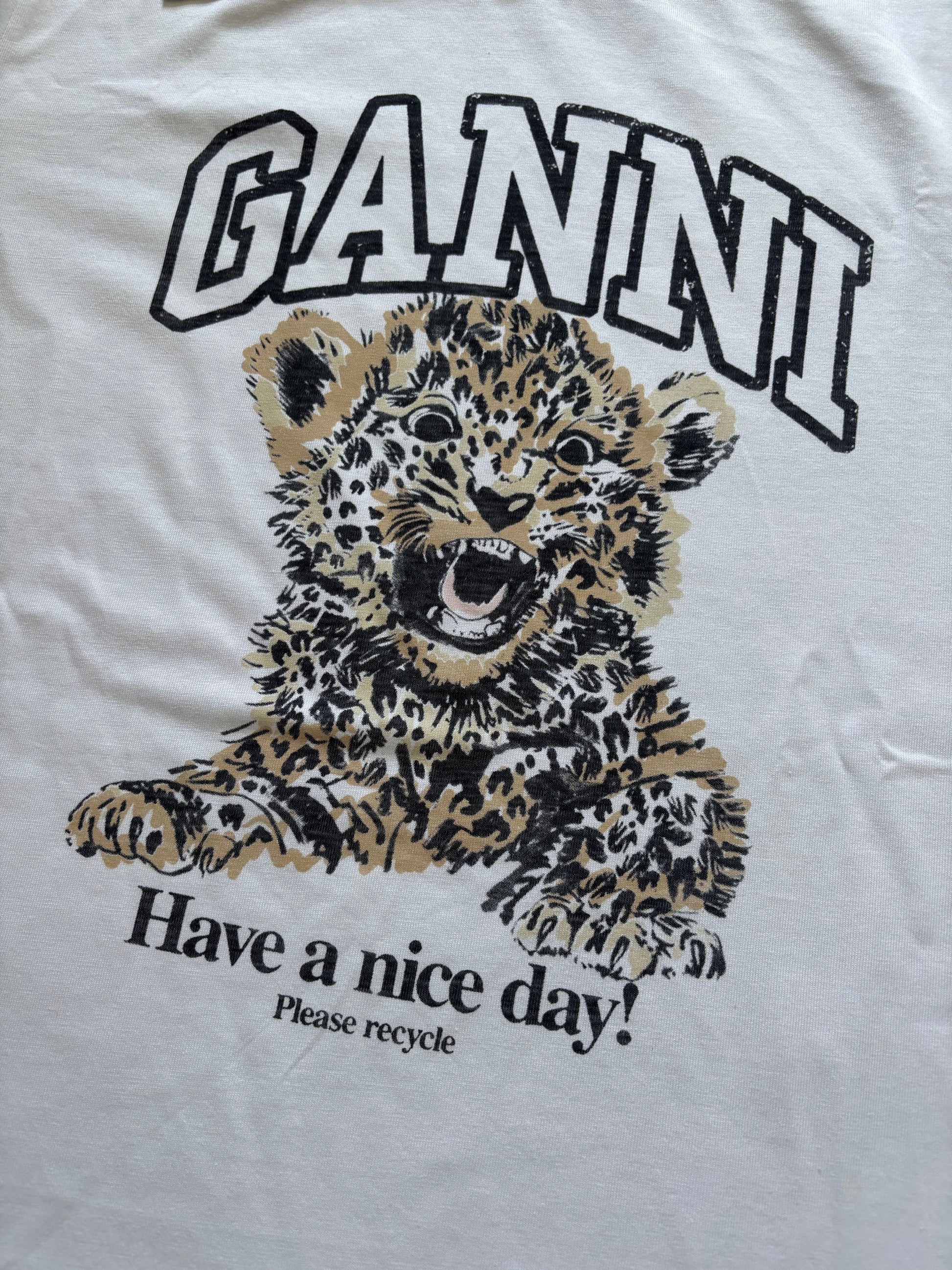 En playful klassiker fra GANNI – denne tee kombinerer humor og stil i ét. Leopardungen med åben mund og det venlige budskab skaber et levende, næsten ironisk udtryk, som fanger øjet.