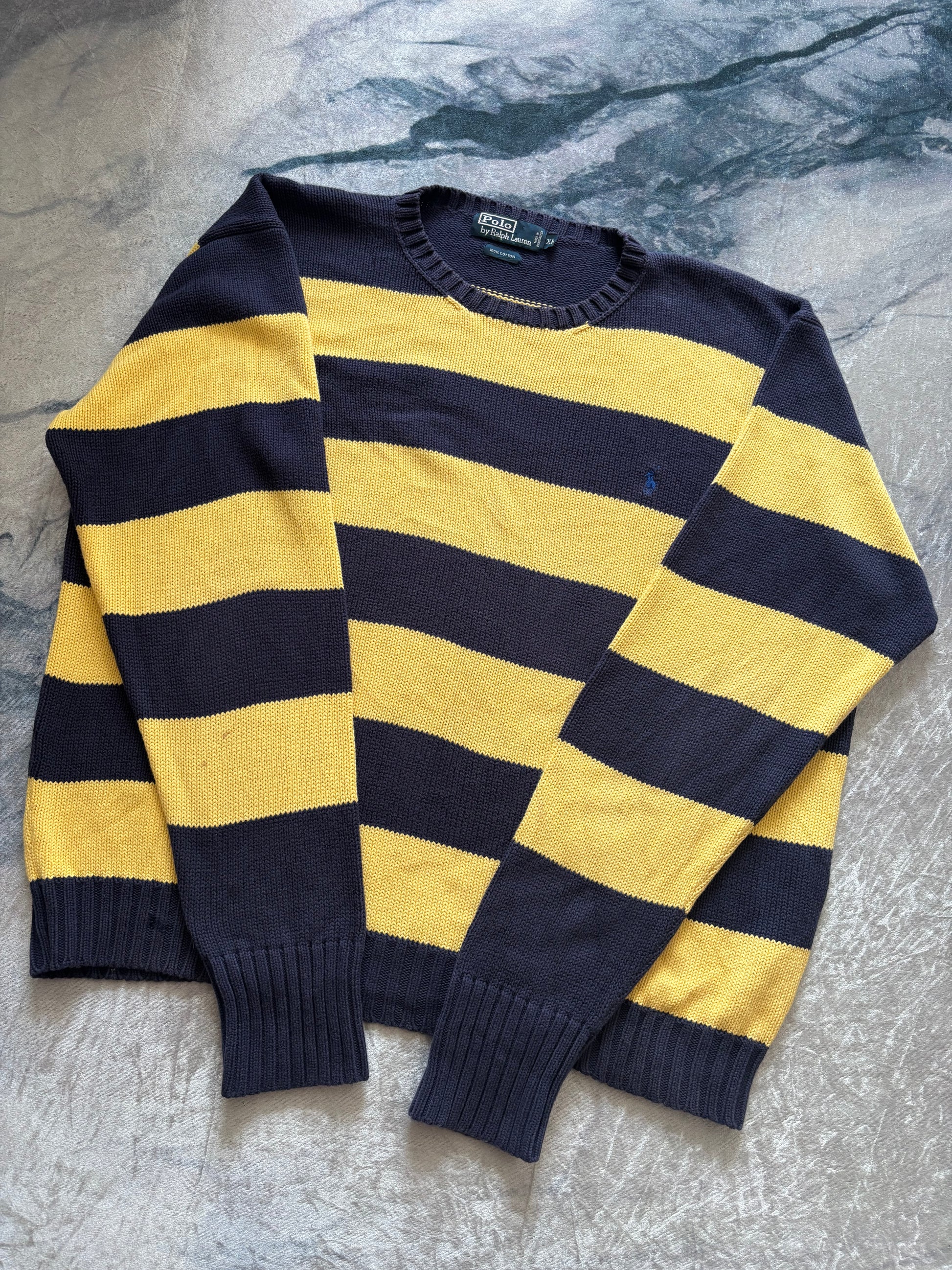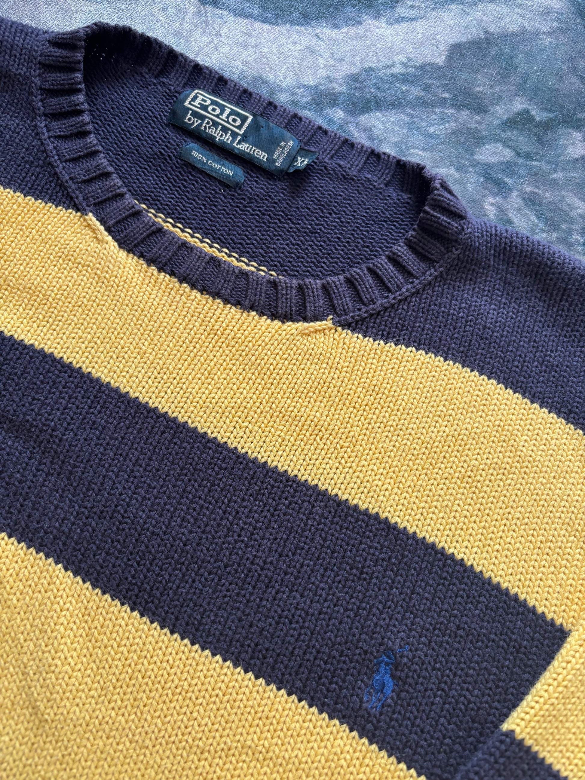Klassisk rugby-inspireret striktrøje fra Polo Ralph Lauren i navy/gule striber. Lavet i kraftig bomuld med casual fit – et tidløst statement-piece til både streetwear og preppy styling.
